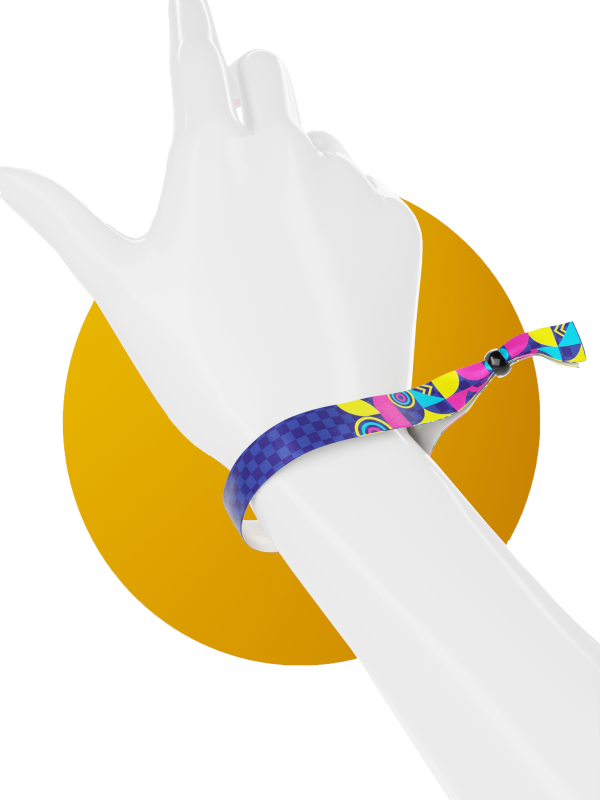 Crea pulseras de tela estampadas personalizadas estilo festival, color morado retro, añadiendo logotipos y texto.